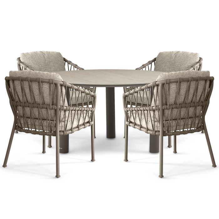De zitting en rug zijn afgewerkt met een unieke rope-structuur van hoogwaardig textileen. Deze verfijnde vlechttechniek zorgt voor een elegante uitstraling en comfortabele ondersteuning. Het materiaal is weerbestendig, kleurvast en geschikt voor intensief buitengebruik.