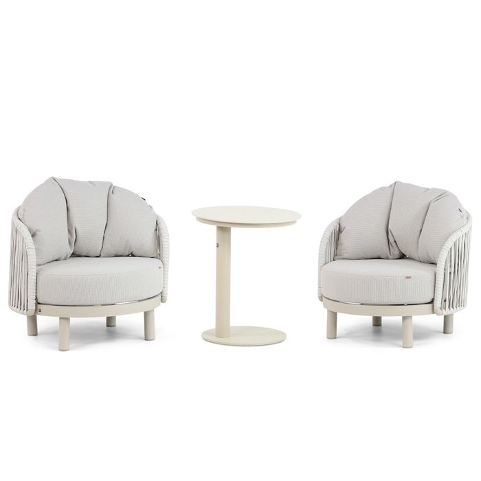De bijzettafel is praktisch en stijlvol, met een aluminium frame en een weerbestendig tafelblad. Het compacte formaat maakt deze set ideaal voor kleinere buitenruimtes, terwijl de hoogwaardige afwerking zorgt voor een luxe uitstraling.