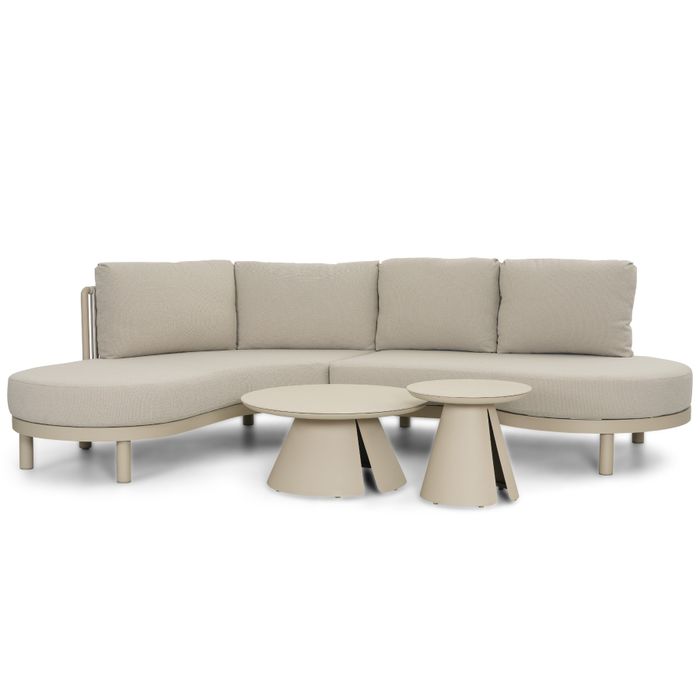 De Santika Nanda/Cayora 50/80 cm organisch loungeset 4-delig in kleur Loft is een exclusieve design loungeset met vloeiende, organische vormen en dubbele luxe loungetafels. Deze stijlvolle opstelling bestaat uit een chaise longue rechts, een eiland module links en twee Cayora loungetafels van 80 cm en 50 cm.