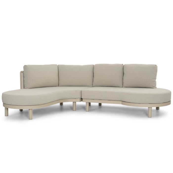 De Santika Nanda organisch loungeset 2-delig in kleur Loft is een exclusieve design loungeset met vloeiende, organische vormen en een moderne uitstraling. Deze elegante opstelling bestaat uit een chaise longue rechts en een eiland module links. Dankzij de zachte belijning en hoogwaardige afwerking vormt deze set een stijlvolle blikvanger voor ieder terras.