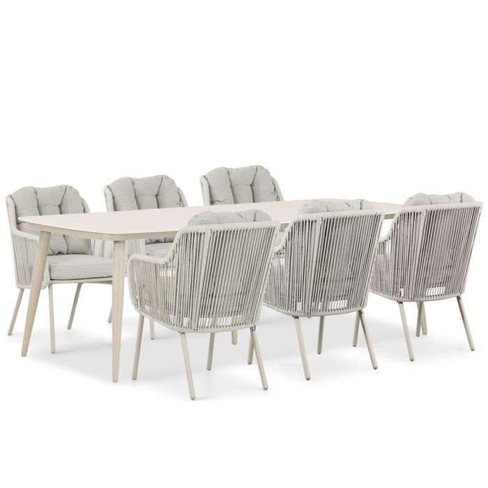 De Santika Nanda dining loft 7-delig is een ruime en stijlvolle dining set die perfect is voor grotere gezelschappen. Deze luxe set bestaat uit zes comfortabele Santika Nanda dining stoelen en de royale Coco Vienna 240 cm dining tafel sand. Het moderne design, gecombineerd met hoogwaardige materialen zoals aluminium en keramiek, zorgt voor een luxe uitstraling en optimale duurzaamheid. Of het nu een diner met familie of een feestelijke gelegenheid is, deze set biedt alle ruimte en comfort om van jouw buitenruimte te genieten. Wil je deze set zelf ervaren? Bezoek dan een van onze 12 Tuinmeubelshop Experience Stores XXL!