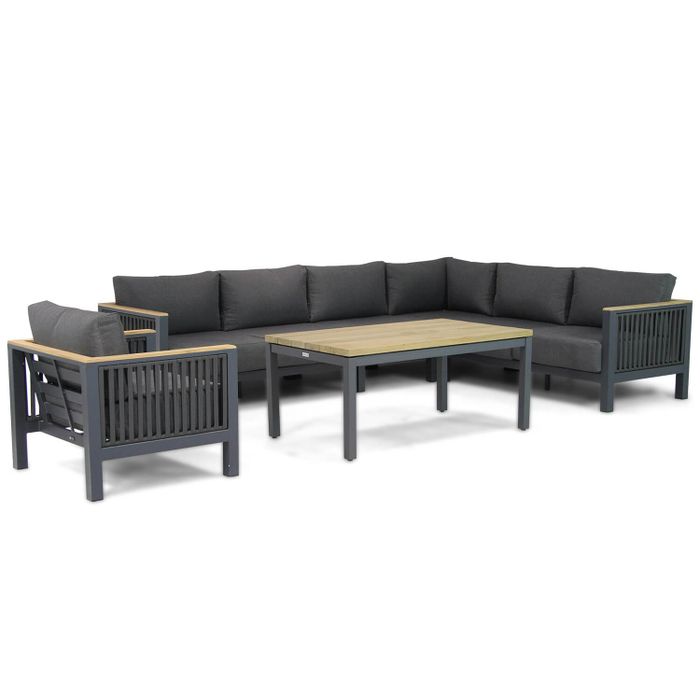 Het strakke hoekset uit de Tuinmeubelshopcollectie bestaat uit drie materialen. Het frame van de loungeset is gemaakt van gepoedercoat aluminium en daardoor onderhoudsvrij. Poedercoating houdt in dat er een harde beschermlaag onder hoge temperatuur wordt aangebracht. Het frame is bespannen met rope. Rope is materiaal dat bestaat uit synthetisch draad. Dit draad wordt tot in de kern gekleurd. Het synthetische draad is erg sterk waardoor het touw niet zal verslappen. Het voordeel van dit materiaal is dat het tegen zowel hoge als lage temperaturen kan en dat het materiaal waterafstotend en schimmelwerend is. Het materiaal rope is dus zeer geschikt voor in je tuin. De armleuningen van de hoekset zijn gemaakt van teakhout. Teakhout is een duurzame houtsoort en heeft een hoog natuurlijk oliegehalte. Hierdoor zijn de houten elementen in het loungeset goed bestand tegen verschillende weersinvloeden. Wel kunnen er door de jaren heen kleine haarscheurtjes gaan ontstaan en zal het teakhout een mooie grijze kleur krijgen. Als je de verschillende materialen wil schoonmaken of beschermen, dan hebben we hiervoor een lijn met onderhoudsproducten van het merk Garden Collections.
