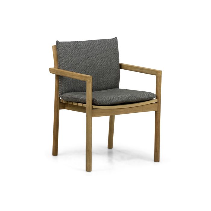 De Santika Suka dining tuinstoel is gemaakt van duurzaam teakhout. Teakhout is een zeer duurzame houtsoort en heeft van nature een hoog oliegehalte. Dit zorgt ervoor dat de tuintafel bijzonder geschikt is voor alle weersomstandigheden. Vanwege de fijne structuur van het hout, voelt het hout glad aan. De tuintafel is geschikt om het gehele jaar door buiten te blijven staan. Omdat teakhout een 100% natuurproduct is, heeft elke tuintafel een unieke en stoere uitstraling. Ook zal het hout, afhankelijk van de weersomstandigheden, kunnen krimpen of uitzetten, waardoor kleine haarscheurtjes kunnen ontstaan. De tuintafel is geschikt om het gehele jaar door buiten te blijven staan. Wel adviseren wij om de teakhouten tuinmeubelen niet af te dekken met een afdekhoes. Teakhout zal na verloop van tijd geleidelijk gaan vergrijzen. Het is ook mogelijk om de tuintafel in de bruine houtkleur te behouden door deze te behandelen met Garden Collections teak protector. De kussens in de kleur smokey grey bieden niet alleen een stijlvolle uitstraling, maar zorgen ook voor een uitstekend zitcomfort. De stof en de vulling van de kussens zijn weerbestendig. Als je ze voor langere tijd niet gebruikt, is het raadzaam de kussens op een droge plaats te bewaren.
