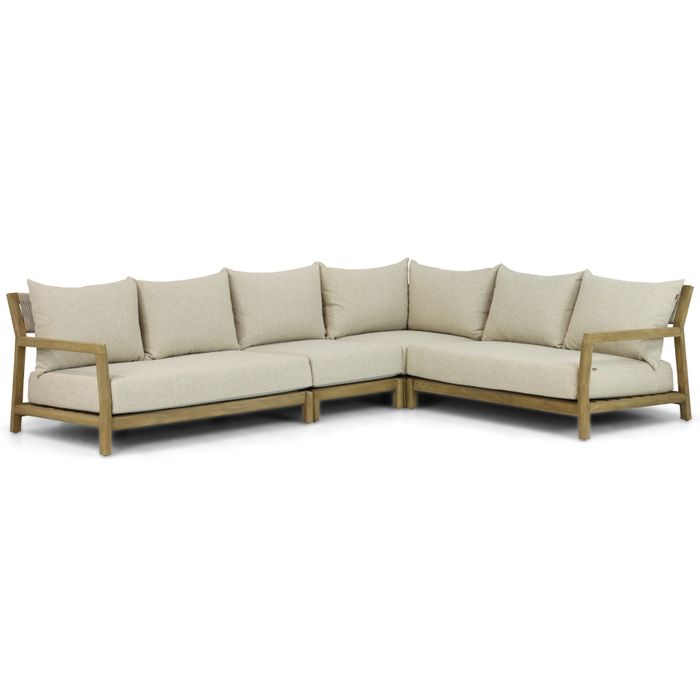De royale kussens zijn gemaakt van waterafstotend materiaal, waardoor ze bestand zijn tegen regen en vuil. Ze bieden uitstekend zitcomfort en zijn eenvoudig schoon te maken, zodat je zorgeloos kunt genieten van jouw loungeset. Het strakke en tijdloze ontwerp van de open banken, hoekmodule en middenmodule combineert perfect met de warme uitstraling van het teakhout, waardoor de set een echte blikvanger is in jouw buitenruimte.