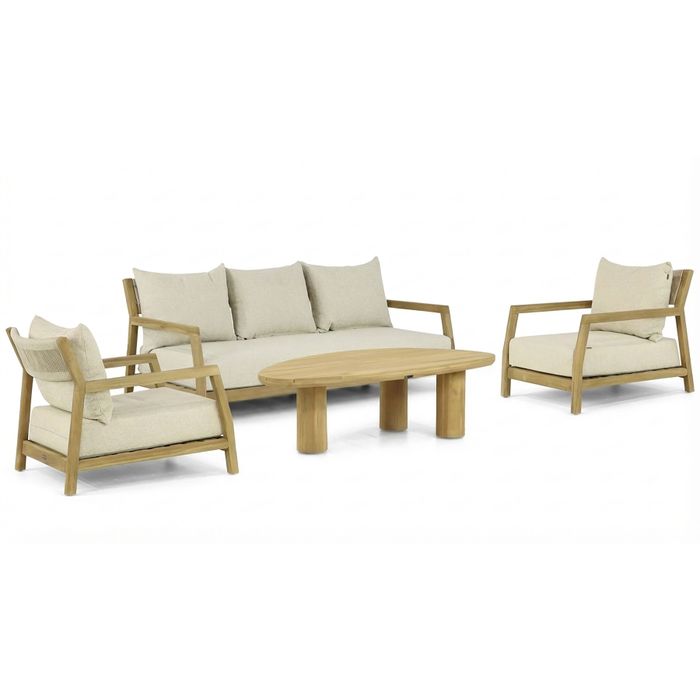 De Santika Suka loungeset 4-delig combineert modern design met natuurlijke elegantie. Deze set bestaat uit twee comfortabele loungestoelen, een ruime loungebank en de stijlvolle Riah loungetafel. De meubels zijn gemaakt van hoogwaardig teakhout, wat zorgt voor een warme en luxe uitstraling. De Riah loungetafel, met zijn organisch gevormde blad, maakt de set helemaal compleet. Dankzij de weerbestendige materialen en comfortabele kussens is deze loungeset ideaal voor ontspannen momenten in jouw tuin of op het terras. Kom proefzitten in een van onze 12 Tuinmeubelshop XXL Experience Stores en ervaar zelf het comfort en de kwaliteit van deze prachtige loungeset!