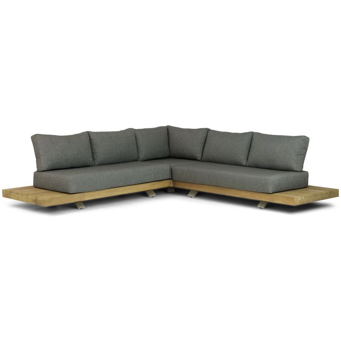 De Santika Supralux hoek loungeset is vervaardigd uit duurzaam teakhout, een sterke en weerbestendige houtsoort die perfect is voor buitengebruik. Dit tropische hardhout is afkomstig van gecertificeerde plantages en krijgt na verloop van tijd een elegante zilvergrijze patina, wat bijdraagt aan de natuurlijke uitstraling van de set. Het robuuste aluminium frame in de kleur Loft zorgt voor extra stevigheid en een moderne uitstraling. Aluminium is licht van gewicht, roestvrij en onderhoudsvriendelijk, wat deze set ideaal maakt voor jarenlang gebruik.