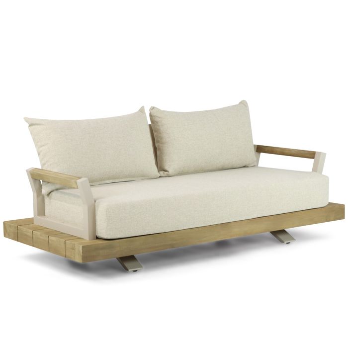 De Santika Supreme lounge tuinbank 2-zits is gemaakt van duurzaam en hoogwaardig teakhout. Teakhout is een zeer duurzame houtsoort en heeft van nature een hoog oliegehalte. Dit zorgt ervoor dat de middenmodule bijzonder geschikt is voor alle weersomstandigheden. Vanwege de fijne structuur van het hout voelt het hout glad aan. De middenmodule is geschikt om het gehele jaar door buiten te blijven staan. Omdat teakhout een 100% natuurproduct is, heeft elke middenmodule een unieke en stoere uitstraling. Ook zal het hout, afhankelijk van de weersomstandigheden, kunnen krimpen of uitzetten, waardoor kleine haarscheurtjes kunnen ontstaan. Wel adviseren wij om de teakhouten tuinmeubelen niet af te dekken met een afdekhoes. Teakhout zal na verloop van tijd geleidelijk gaan vergrijzen. Het is ook mogelijk om de middenmodule om de bruine houtkleur te behouden door deze te behandelen met Garden Collections teak protector. De rugleuningen zijn gemaakt van aluminium. Aluminium heeft als voordeel dat het licht van gewicht is en onderhoudsvrij. Poedercoaten is een elektrostatisch proces waarbij poeder op het aluminium wordt aangebracht. Vervolgens wordt dit verhit in een oven. Tijdens het uitharden worden de poederdeeltjes door de warmte eerst vloeibaar, daarna stroperig en ten slotte uitgehard tot een mooie en duurzame coating op het frame.