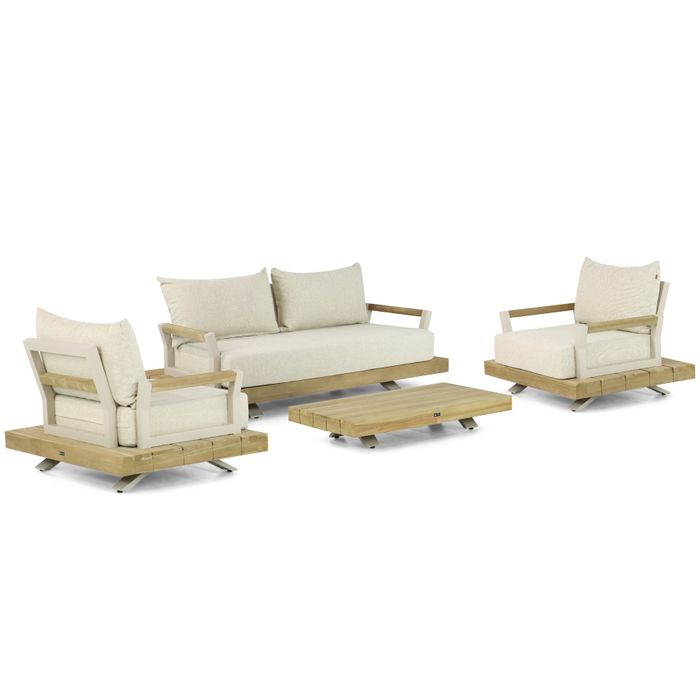 Het teakhout is afkomstig van gecertificeerde plantages en afgewerkt met een natuurlijke coating, waardoor het bestand is tegen weersinvloeden en eenvoudig te onderhouden is. De dikke, comfortabele kussens zijn bekleed met een waterafstotende en vuilbestendige stof, zodat je zorgeloos kunt genieten van ultiem zitcomfort. De ergonomische vormgeving maakt deze set perfect om heerlijk te ontspannen, zowel alleen als met gezelschap.