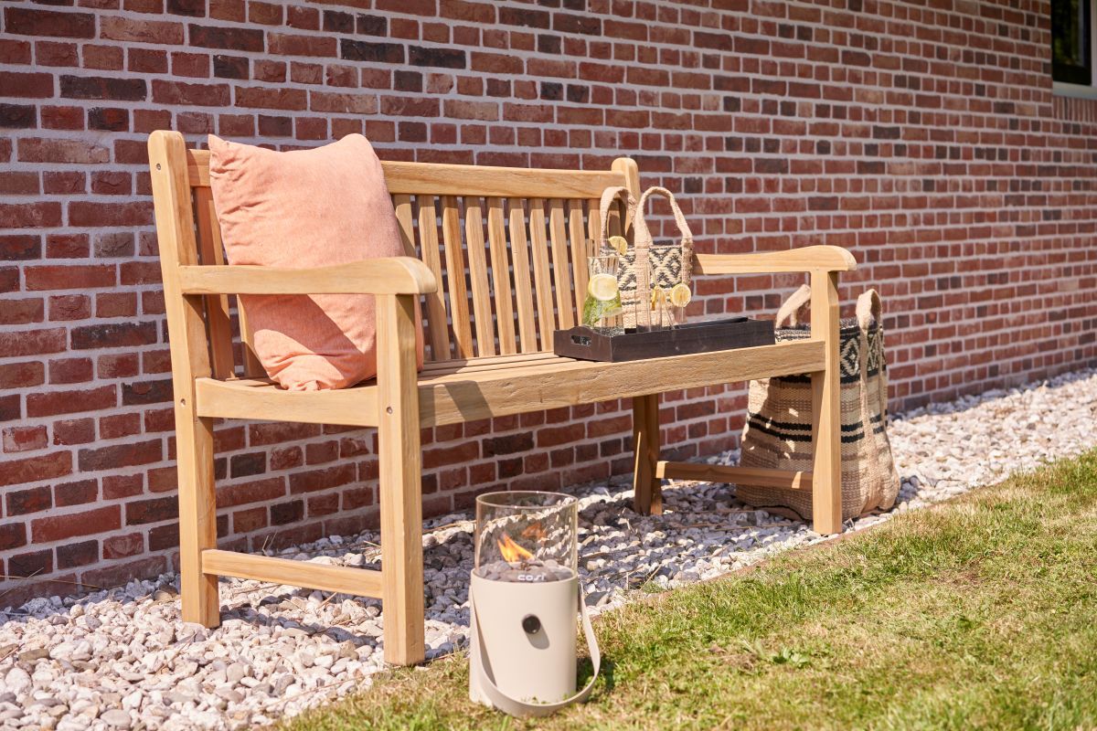 Veel mensen kiezen voor teakhout, omdat dit van nature olie bevat die het hout beschermt tegen vocht en schimmel. Daardoor blijft de bank jarenlang sterk en stabiel, ook als hij het hele jaar buiten staat.
