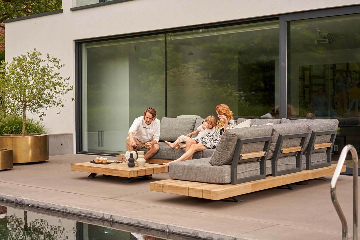 Vooraanzicht van een veranda met een industriële stijl, voorzien van een platform loungeset met grijs aluminium en teakhout. Vooraanzicht van een veranda met een industriële stijl, voorzien van een platform loungeset met grijs aluminium en teakhout.