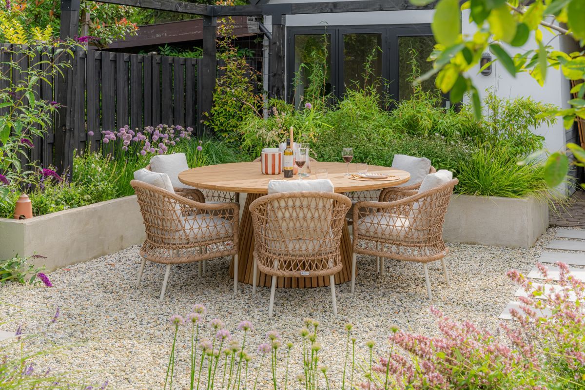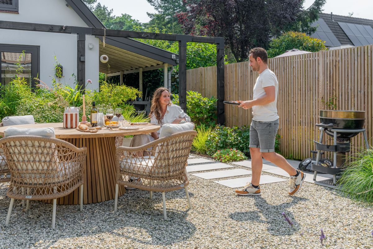 Voor een ronde tuinset voor 6 personen heb je ongeveer 3,5 tot 4 meter ruimte nodig. Zo kun je makkelijk rond de tafel lopen en de stoelen naar achter schuiven. Heb je een kleiner terras? Dan is een ronde set vaak juist handiger, omdat je efficiënter gebruikmaakt van de ruimte.