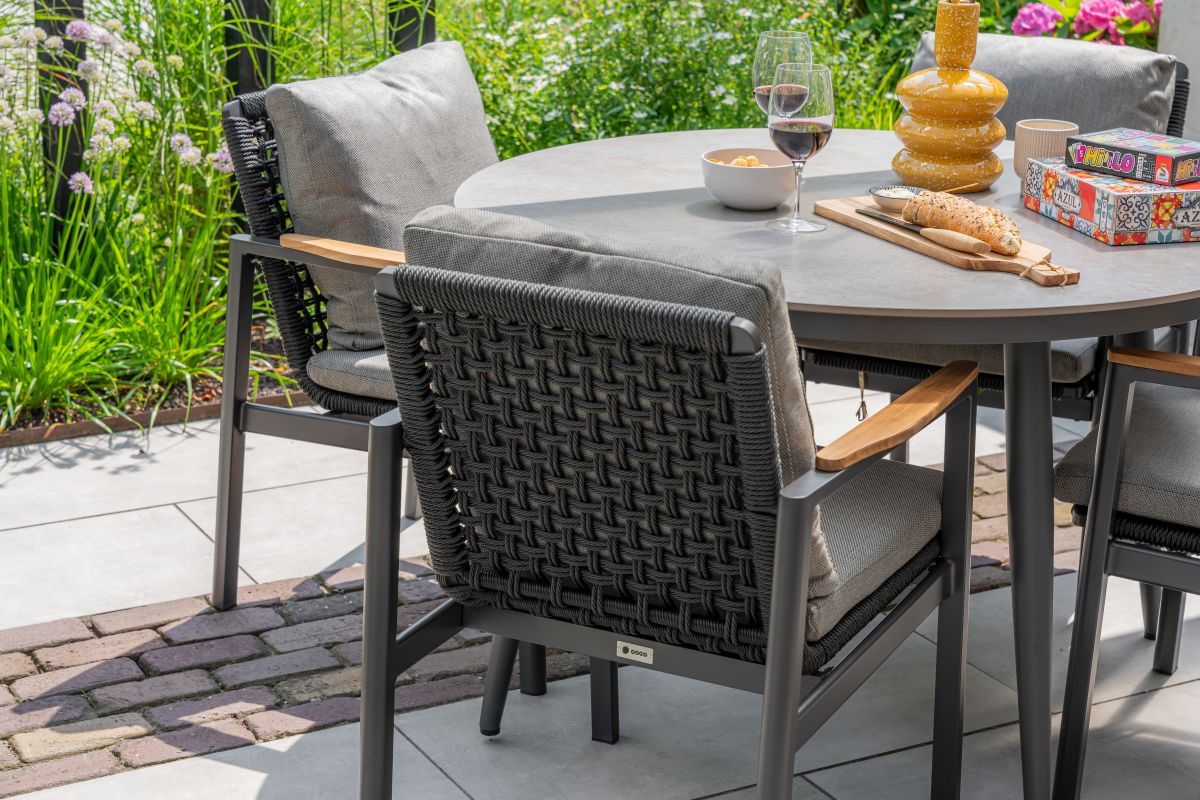 - Materialen: Je hebt de keuze uit terrasstoelen van aluminium, kunststof, rope of teak. Aluminium is licht, roestvrij en modern, kunststof is onderhoudsarm, hier heb je geen omkijken naar. Terrasstoelen van rope geven je terras een luxe uitstraling en teakhout geeft een warme, natuurlijke look aan je terras.