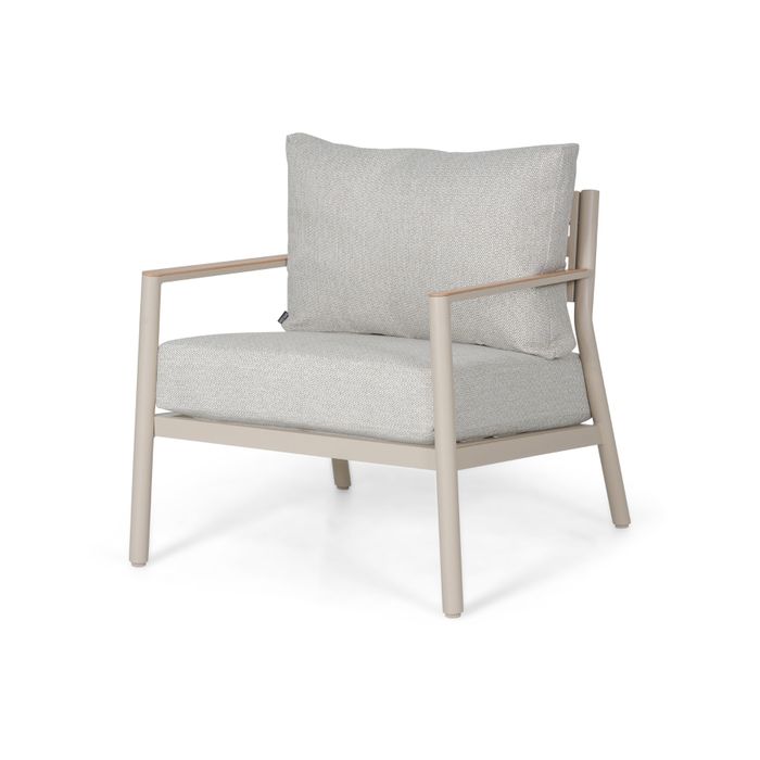 Het frame is slank vormgegeven en uitgevoerd in een zandkleurige afwerking, wat de stoel een frisse en eigentijdse uitstraling geeft. De armleuningen zijn afgewerkt met een houtlook accent, waardoor de stoel nét wat warmer oogt en mooi combineert met allerlei tuinmaterialen. De kussens zijn comfortabel en ondersteunen goed, ideaal voor lange avonden buiten. Extra praktisch: de kussenhoezen zijn afritsbaar, zodat je ze eenvoudig kunt reinigen.